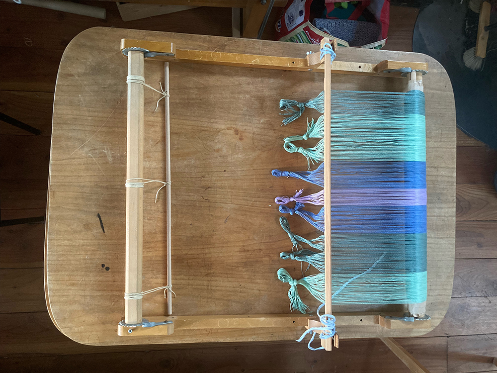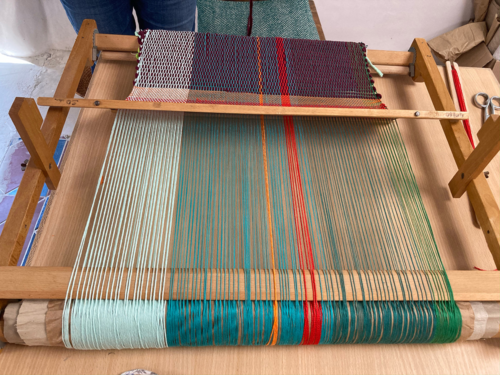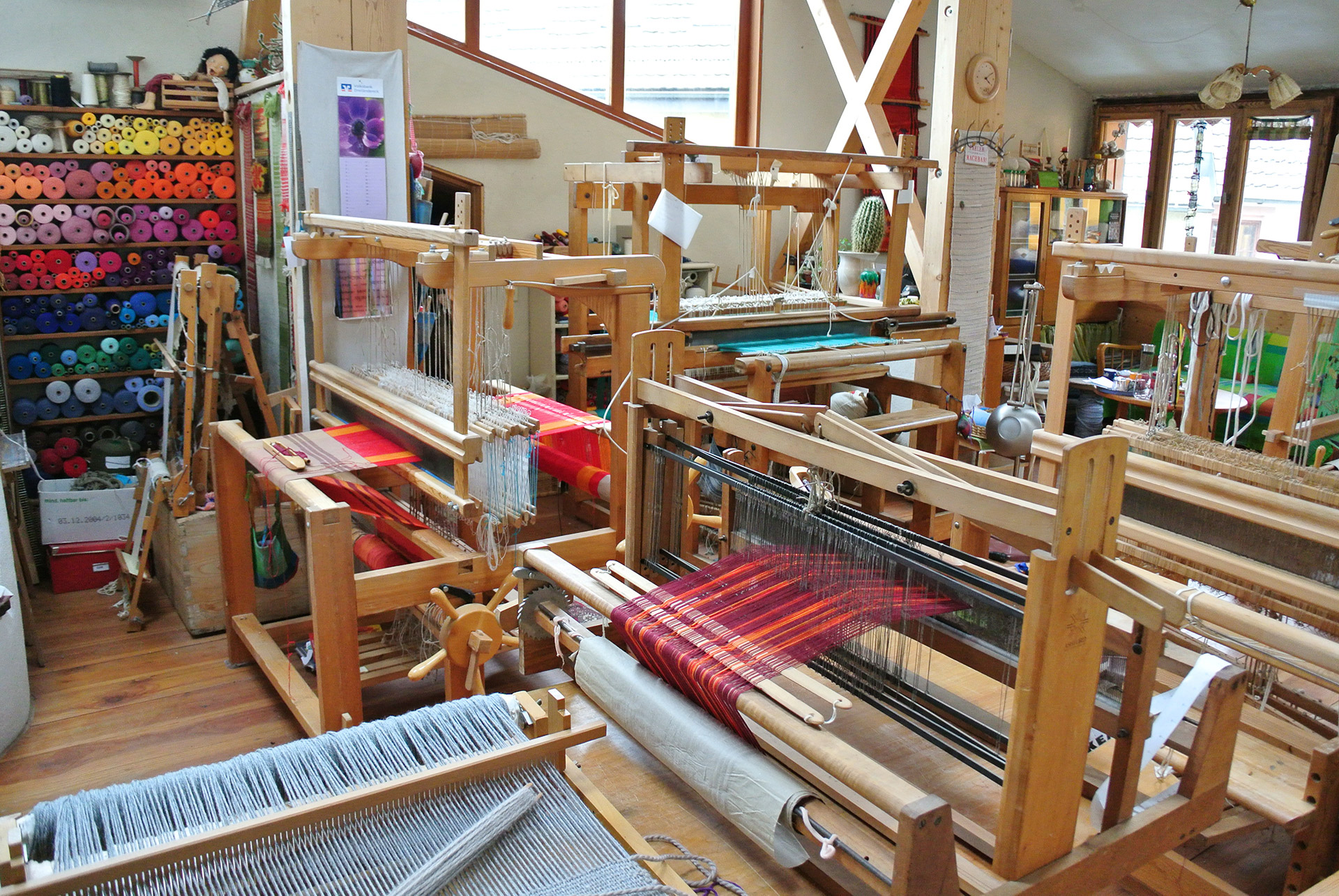 Auf ca. 80 m² stehen derzeit sechs Flachwebstühle mit Webbreiten zwischen 90cm & 180 cm, mit 4 - 10 Schäften, davon drei mit Schnellschussvorrichtung, sowie zwei Hochwebstühle mit 150cm & 200 cm Webbreite für Teppiche bzw. Gobbelins und ein Musterwebstuhl mit 12 Schäften zum entwicklen von Stoffproben und Mustern. Ausserdem gibt es verschiedene Webrahmen und Spinnräder und viele unterschiedliche Naturgarne.